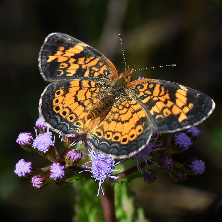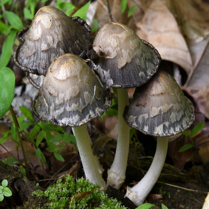 The edge of the woods where it meets my yard is a living threshold—an ecotone neither fully wild nor wholly domestic, but something in between. It’s a shifting border where birds, insects, and animals cross freely, where light filters differently as it passes from open space to tree canopy, where grasses give way to understory plants and leaf litter. Plants like Hemp Dogbane, Blue Mistflower and Tick Trefoil flourish there, along with the insects that use them, and I often find mushrooms on fallen trees that are decomposing along the wood’s edge.