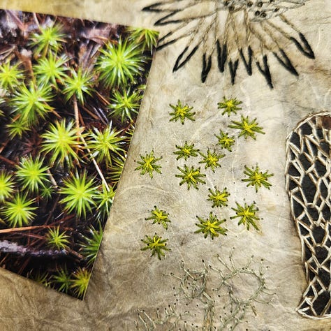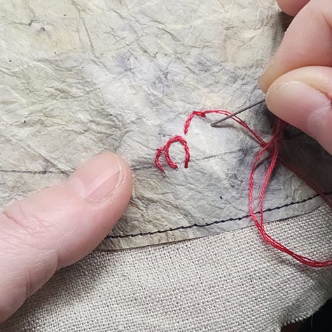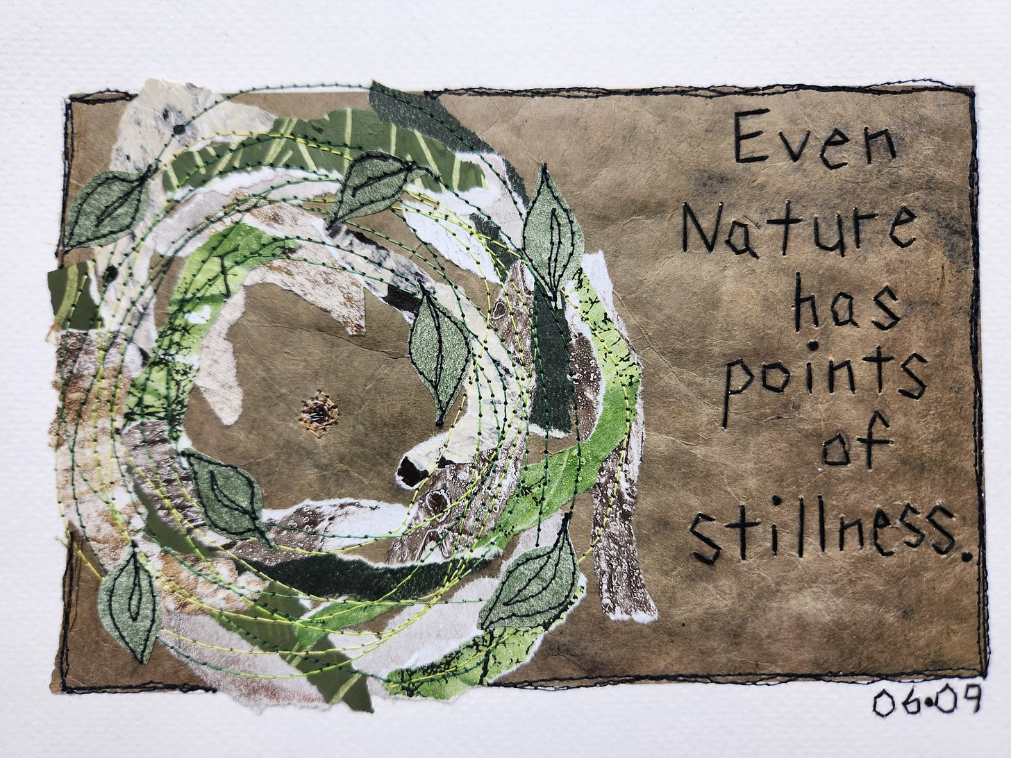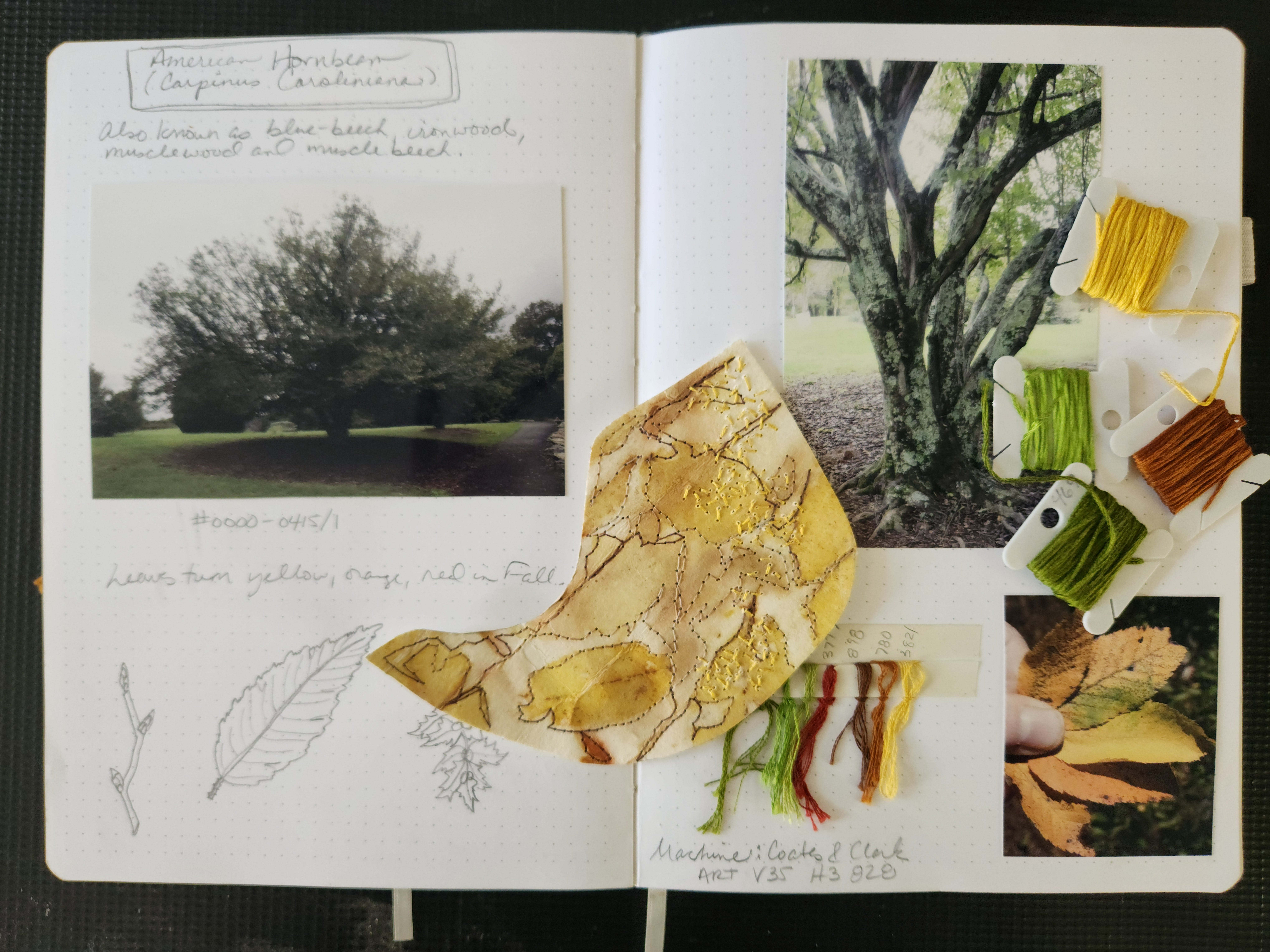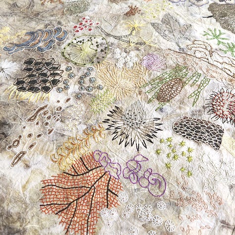 Living always in an in-between state of good days and bad days, temporary improvements and setbacks, never knowing if tomorrow I will be able to accomplish something I set my mind to today - this takes away any illusions of permanence and control. Likewise, my artwork that explores illness and grief also contains more room for chance, following where the materials and processes lead. Eco-printing with plants is a process of exploration and surprise, and I intuitively stitch into the materials I eco-print, relinquishing a lot of control over the art-making process. Somehow, the collaboration with the materials and chance has resulted in artwork that is more personal, more meaningful to me.