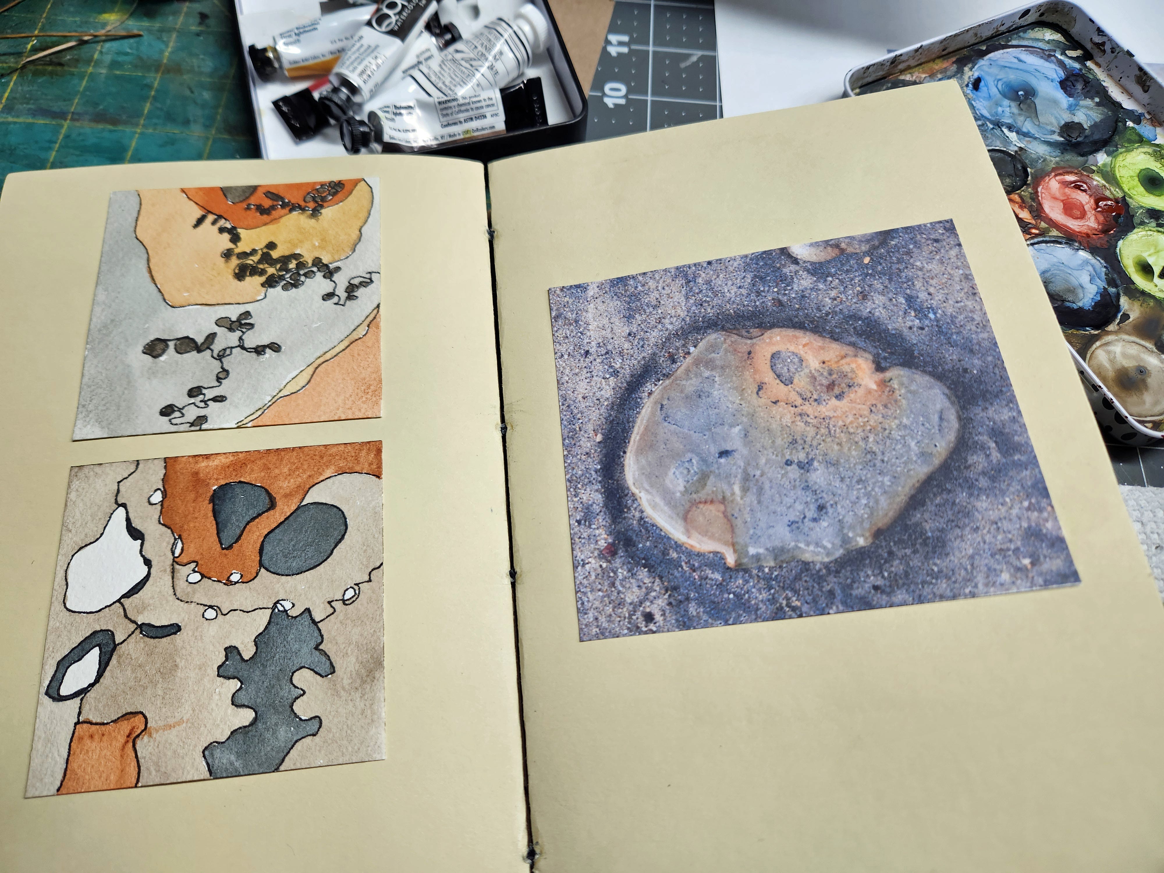 Over my two weeks at the National Park, I felt pulled again and again to visit these stones on this beach. I photographed and sketched dozens and dozens of them. Though I don’t yet know where it will lead (another liminal space I’m occupying, one between initial idea and project), I’m starting to explore compositions that the stones offer up to me.
